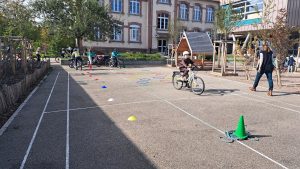 Profitant du parc de vélos prêté par l’Eurométropole, la classe de CM2 de monsieur Raphalen a testé un parcours établi dans la cour végétalisée de l’école.