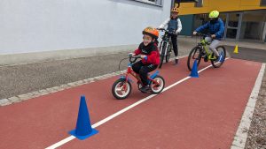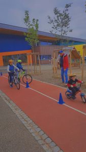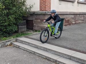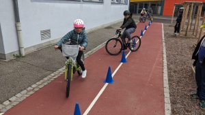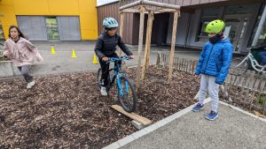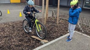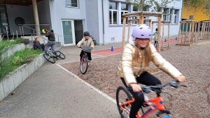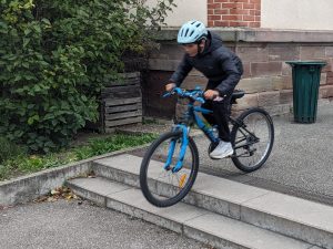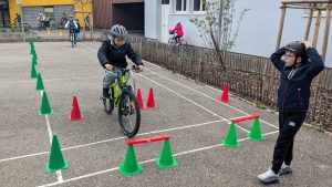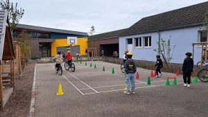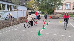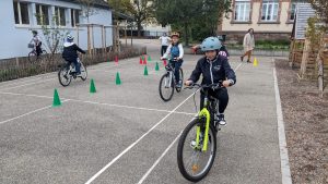 Profitant du parc de vélos prêté par l’Eurométropole, la classe de CM2 de monsieur Raphalen a testé un parcours établi dans la cour végétalisée de l’école.